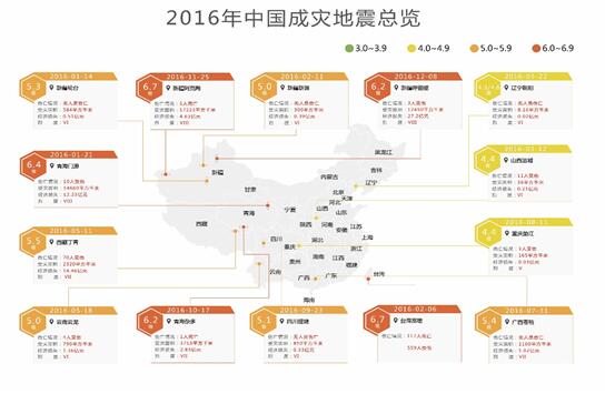 中国地震台网中心官方数据显示,2016年1月1日至12月20日,中国大陆地震共造成灾害事件15次,较大地震灾害3次,一般地震灾害12次,共造成2人死亡,101人受伤,直接经济损失65.5亿元。