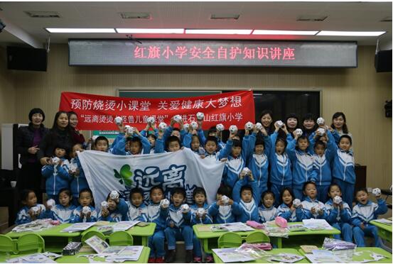 给孩子们发教材《儿童预防烧烫伤科普工具包》 孩子们合影时喊着“冲、脱、泡、盖、送”! 烧烫伤关爱公益基金在2017年计划更大范围推广“远离烫烫小怪兽儿童课堂”,欢迎各幼儿园、小学积极参与到活动中来,也希望更多爱心力量能支持儿童预防烧烫伤科普公益活动走进千千万万孩子身边,为降低中国烧烫伤发生率而努力! |
