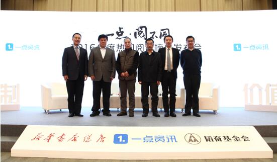 1月16日,“‘一点·阅不同’2016年度热门阅读榜单”发布会在京举行,这是继2016年9月一点资讯与新华书店总店达成战略合作后,首次联合颁布年度热门阅读榜单。会上,一点资讯还发布了“2016年度阅读兴趣报告”。韬奋基金会理事长聂震宁,新华书店总店总经理茅院生,一点资讯CEO李亚,著名作家梁晓声,北京大学教授王余光,一点资讯副总裁金治等领导嘉宾共同出席。