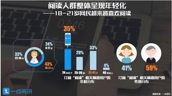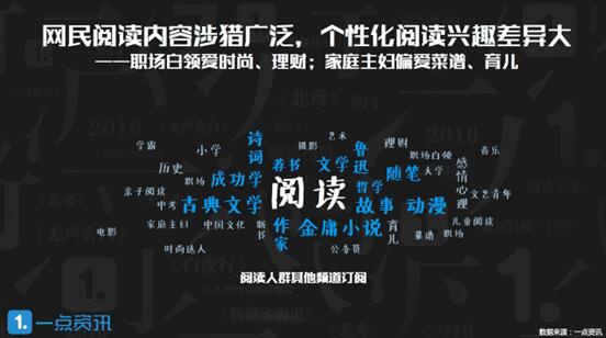 一点资讯副总裁金治发布“2016年度阅读兴趣报告” 本次报告从年龄、热点、地域分布等多个维度,利用大数据技术对平台海量“阅读”相关频道用户的阅读行为进行了深度分析解读。报告数据显示,2016年平台阅读人群整体呈现年轻化,男女性阅读比例趋于平衡;而就地域角度而言,北上广等一线城市首当其冲引领阅读潮流;其中,科幻类作品最受追捧,网络小说热度依旧;此外,亲子阅读逐渐成为父母教育子女,与子女沟通的重要方式。 纸质+电子阅读构筑兴趣阅读,知青文学备受欢迎 金治透露,随着“全民阅读”的推广与深化,我国国民的知识积淀和文化素质也不断提升,这一趋势在一点资讯的阅读调查上得到直观体现。报告显示,网友对畅销书、知名作家、书荐等资讯内容兴趣较高,关键词词云涵盖阅读方式、图书出版、热门书籍、知名作家等阅读相关的方方面面,截止2017年1月8日,一点资讯平台内与图书、阅读相关的频道订阅量已超510万。