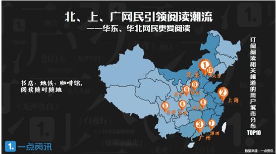北上广等一线城市用户成阅读主力军 报告数据显示,订阅“阅读”相关频道的用户所在地Top 10多为经济、文化发达的城市,北、上、广等一线城市用户成为阅读的主力军,因城市建设的发达,除了传统线下书店,地铁、咖啡馆也成为网民集中阅读的新坐标;从地域范围看,华东、华北地区网民更爱阅读。这也侧面反映出城市的经济发展程度往往与其居民对教育、阅读的高度重视成正比。