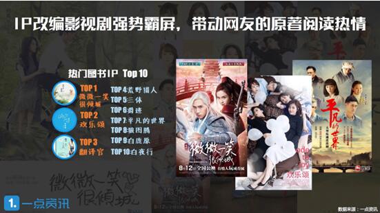IP改编影视剧强势霸屏,引领原著阅读热 数据显示,2016年IP改编热度不减,各类IP改编剧横扫大小银幕并同步带动原著大热。在热门图书IP Top 10中,《微微一笑很倾城》、《欢乐颂》、《翻译官》名列前三。其中,《微微一笑很倾城》的影视作品通过暑期电影、电视剧连续档霸,收获了网友对原著图书及作者本人的高关注度。