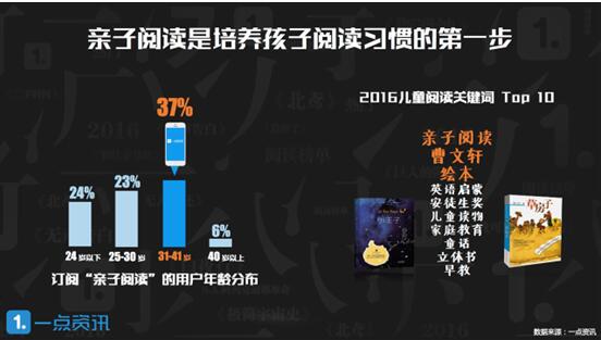 亲子阅读成家庭教育沟通新辅助方式 通过对 “少儿阅读”关键词分析发现, 31-40岁的人群以37%的占比排名“亲子阅读”首位,人群年龄与高占比分别反映了我国近年来晚婚晚育的特殊国情。 在一点资讯平台上,“亲子阅读”在2016儿童阅读关键中高居榜首,进一步说明,亲子阅读正在成为父母对子女教育沟通过程中重要的辅助。同时,也是随着国民知识文化水平的提高,父母在学习如何与子女相处,探寻更理性、科学家庭教育方式的真实反映。