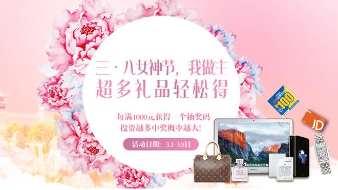 此次聚宝珠举办的38女神节活动,所有用户投资1000元均会获得一个中奖码,开奖码以公正的上证收盘指数为准,投资者均有机会赢取丰厚的礼品,例如LV包包、浪琴手表、兰蔻香水,最新款的iPhone手机、MacBook电脑、kindle等,还有一大波话费、流量等着大家。 活动设置了1000元的投资门槛,对于大多数投资人来说是轻轻松松,活动投资时间为2017年3月1日-3月8日。另外活动期间共开3次奖,分别为3月3日、6日、9日,且设置了一、二、三等奖以及幸运奖,获得奖励的几率还是很大的。 以上为大家盘点的,都是一些较为知名的平台,从活动形式来看,小编觉得真是丰富又多彩呢,特别是聚宝珠平台,仅投资1000元就有机会赢取价值万元的超值大奖。大家在投资的时候,要看清各自的活动奖励规则及投资条件,根据自己的资金情况选择合适的平台。不过主题性活动时间是有限的,心动的就抓紧参与吧! |