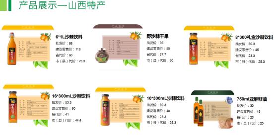 现状与规划,诠释领导品牌的“高瞻远瞩” 衡量品牌的首要因素是什么?是销量,“农到家”的销售网络几乎遍布全国,除海南、香港、台湾、澳门因为运费原因外,右玉特产已销往全国;采用国内领先的GIS进销存平台,数据与图形结合,实时掌握各分销商的销售和财务情况;注重知识产权,已获得外观专利三项、发明专利一项、实用新型一项、商标七个。 作为沙棘饮料的领导品牌,“农到家”制定发展规划,2017年将山西大部分的特产纳入现有的销售平台、2018年将国内知名的特产纳入平台、2019年目标实现线上线下销售额达到1千万元,诠释领导品牌“高瞻远瞩”的魄力与实力。