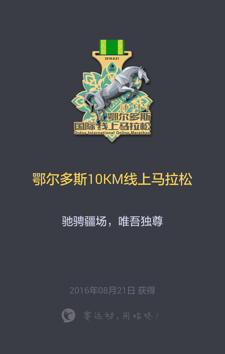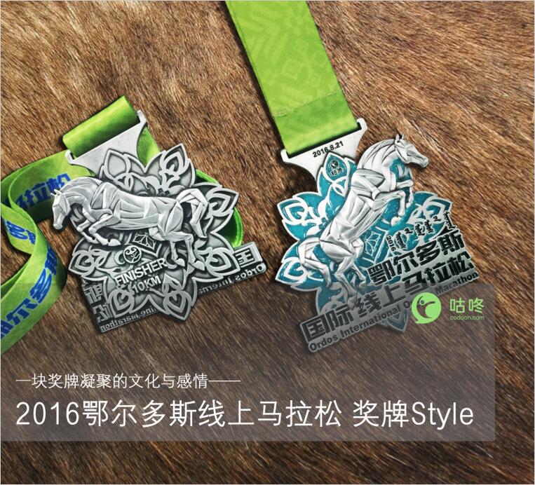 2016鄂尔多斯国际马拉松赛最吸引人的地方,莫过于终点设在著名的成吉思汗陵,中国新兴的煤都,融地域特色、历史文化、民族风貌、草原风情于一体的景观赛道,对12585名参与者是独一无二的体验,全国最大运动社交平抬咕咚举办的鄂尔多斯线上马拉松,在线下赛当天吸引到超过20万跑友参与,“翻煤山”也成为了脍炙人口的跑马口号。 “翻煤山”这一段子来自当年春晚相声大师姜昆的节目《着急》,在此次咕咚鄂尔多斯线上马拉松被跑友引用,立刻获得大量追捧。有意思的是,线上赛的奖牌和“煤都”没什么关系,创意来自蒙古草原最常见的动物:马。冰蓝色的花瓣托起奋蹄跳跃的奔马,象征着活力和生机,充满强烈的奔跑暗示。
