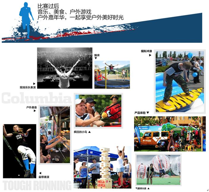 比赛过后,还会有一场调动全身细胞的最FUN 嘉年华,专业DJ和现场live乐队会点燃火爆的气氛,来自自行车、扁担等不同行业的户外高手,会带来令人拍手叫绝的极限表演。现场还安排了许多互动性游戏,你可以化身成“疯狂的小鸟”拯救鸟蛋,或变形为可爱的“气球人”,来一场气囊球大战;蹦床、模拟冲浪、巨型积木……每一项都是刺激肾上腺素的极限元素。 笑声、尖叫声、音乐声,怎么能少了开怀的户外派对和美味的户外BBQ美食,多种多样的饕餮美食,会让你食指大动,味蕾全开。与好友们碰杯祝贺,开怀大笑吧,请相信,这个周末会成为这个秋季,你脑海中最闪亮的那个记忆。 关于Columbia Columbia成立于1938年Columbia Sportswear源自美国波特兰市,以不同独创科技, 令消费者们可以更长时间享受户外的乐趣。哥伦比亚天猫官方旗舰店(columbia.tmall.com)是此次赛事的唯一报名渠道。报名通道全面开启,马上参与报名吧。或扫二维码进入哥伦比亚天猫旗舰店进行报名。