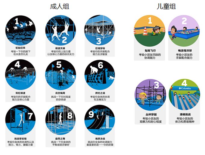 现场有极具观赏性和挑战性的10公里障碍极限酷跑,将会带给你一场全新体验,体能和身手的挑战,奋力跨越,把障碍甩在身后。在全程10km的赛道中,参赛者会遇见9种新奇的障碍,从独木桥到轮胎巨墙,从扁担之舞到巨型台阶,从漂移攀岩墙到高空绳网挑战,这是一条颠覆体能的线路,同样也考验着你的协调能力和胆量。 户外是流行的亲子活动,Columbia Tough Running极限酷跑同样也为亲子家庭,特别是学龄前4-6岁的孩子设置了儿童500米障碍赛,一路上会经过丛林穿越、海洋球、迷幻城堡、贴地飞行等特别的障碍,不仅锻炼了孩子面对困难的勇气和胆量,也是增加亲子感情的绝妙机会,会为你留下一次全家共同迎接挑战的难忘体验。