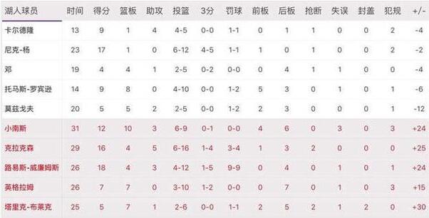 到了次节,沃顿大手一挥,让五个流氓替补上场,小南斯面对米尔萨普的防守丝毫不怵,上场3分钟就拿到8分三篮板,中投、抛投、暴扣以及补篮,进攻手段非常丰富,在他的带领下,湖人将分差缩小到4分。英格拉姆连得5分,和小南斯联手打出一波18-6,帮助湖人将比分反超。