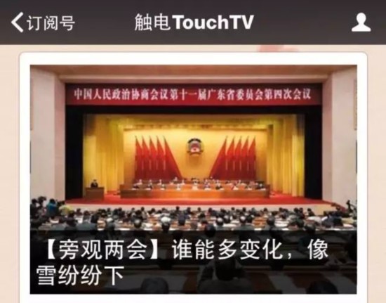 “聚焦两会” 动态报道,提前策划;量身定制两会专栏,提前议题;直播两会,技术先行。两会召开在即,电视新闻中心在台领导的统一部署下,创新融合媒体宣传方式,全媒体部、时政部、民生部、新闻频道等多部门同时发力,在全力做好会议报道的同时,力争在新媒体寻求“突破”。 1月23日-1月30日期间,电视新闻中心在《广东新闻联播》、《正午看天下》、《新闻晚高峰》、《新闻大视野》、《今日关注》、《珠江新闻眼》、《今日最新闻》、《今日一线》等栏目累计滚动播发两会新闻近百条。与此同时,节目被推送到包括光明网、新浪、网易、搜狐、央视网、21CN、南方网、金羊网、大洋网、中国日报网、财经网等多个新媒体平台,并尝试与垂直资讯应用软件ZAKER合作,在“触电TouchTV”频道发布两会最新资讯,权威精彩的内容、耳目一新的形式,受到社会各界的广泛好评。 二、新媒体发力 【旁观两会】有料又有趣