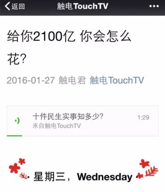第二篇推送《给你2100亿,你会怎么花》讲的其实是2016年广东将投入2100亿在十件民生实事上。