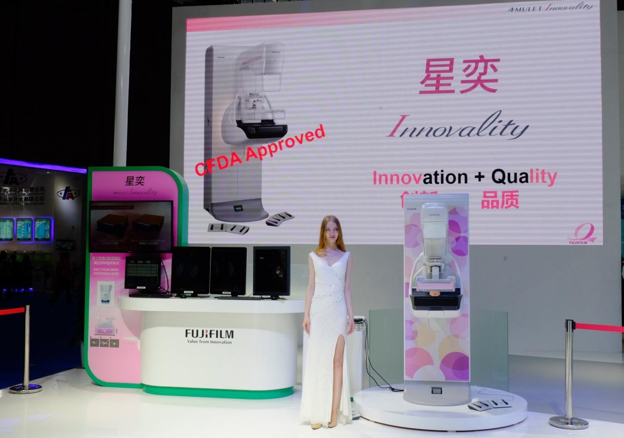 富士胶片展台人头攒动 创新科技 关怀倍至 进入富士展台,迎面即可看到DR区域,星奕微剂量多功能乳腺摄影系统作为乳腺DR产品主力,凭借HCP蜂窝状平板探测器、双模式乳腺断层摄影、±7.5º和±20º两种角度可选角度扫描模式等创新技术和不同以往的精巧外观,受到许多观众欢迎。
