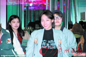 白百何骨裂,拄着拐杖亮相。