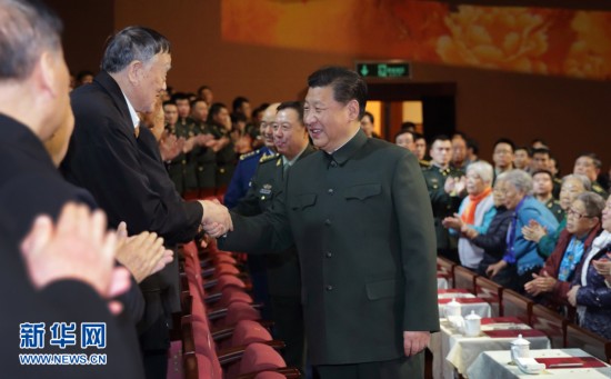 中共中央总书记、国家主席、中央军委主席习近平出席,向在场的军队老同志,向全军离退休老干部,致以新春问候和祝福。(新华社记者李刚摄) 中央军委慰问驻京部队老干部迎新春文艺演出1月28日在京举行。中共中央总书记、国家主席、中央军委主席习近平出席,向在场的军队老同志,向全军离退休老干部,致以新春问候和祝福。 清风浩荡迎新春,战歌嘹亮军旗扬。中华民族传统猴年春节即将到来之际,为民族独立和解放建立卓越功勋、为国家和军队建设作出突出贡献的驻京部队老干部欢聚一堂。回顾过去一年,大家深切感到,在党中央、中央军委和习主席坚强领导下,全军和武警部队扎实抓整顿、抓备战、抓改革、抓规划,国防和军队建设再上新台阶,书写了政治建军、改革强军、依法治军的崭新篇章。大家一致表示,新的一年要深入学习贯彻习主席系列重要讲话精神特别是国防和军队建设重要论述,以党在新形势下的强军目标为引领,沿着中国特色强军之路奋勇前进,不断开创强军兴军新局面。 文艺演出分为“铁血雄师”“清风浩荡”“奋楫前行”3个乐章,集中反映全军部队铸魂固本、整风整改、练兵备战、深化改革的新实践新气象,生动展现广大军民奋力实现中国梦强军梦的时代风采。雄壮激昂的大合唱《改革强军路上》拉开了演出序幕。合唱《把青春压进枪膛》、领唱与合唱《钢铁舰队进行曲》《强大机群向前飞》《点火》《如虎添翼》《忠诚卫士歌》《当那一天来临》、集体舞《决胜疆场》,表达了全军各军兵种和武警部队将士英勇顽强、敢打必胜的昂扬斗志。领唱与合唱《古田新风吹过来》《英雄万岁》《四有军人歌》《天下乡亲》、联唱《优良传统代代传》,唱传统、赞英雄、扬正气,展示了全军部队深入贯彻落实全军政治工作会议精神,弘扬优良传统、永葆宗旨本色的新风新貌。舞蹈《看齐·看齐》、领唱与合唱《强军之路》,表达了全军官兵坚决听从党中央、中央军委和习主席指挥,积极投身改革强军的钢铁意志。领唱与合唱《大地芬芳》、合唱《天耀中华》,表达了军民同心共筑中国梦的美好追求,抒发出人民群众和部队官兵对以习近平同志为总书记的党中央高度信赖、衷心拥戴的真挚感情。 中共中央政治局委员、中央军委副主席范长龙,中共中央政治局委员、中央军委副主席许其亮,中央军委委员常万全、房峰辉、张阳、赵克石、张又侠、吴胜利、马晓天、魏凤和陪同观看。 观看演出的还有军队老同志代表,军委机关各部门、驻京各大单位和武警部队领导。(记者孙彦新) |