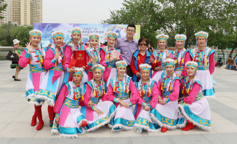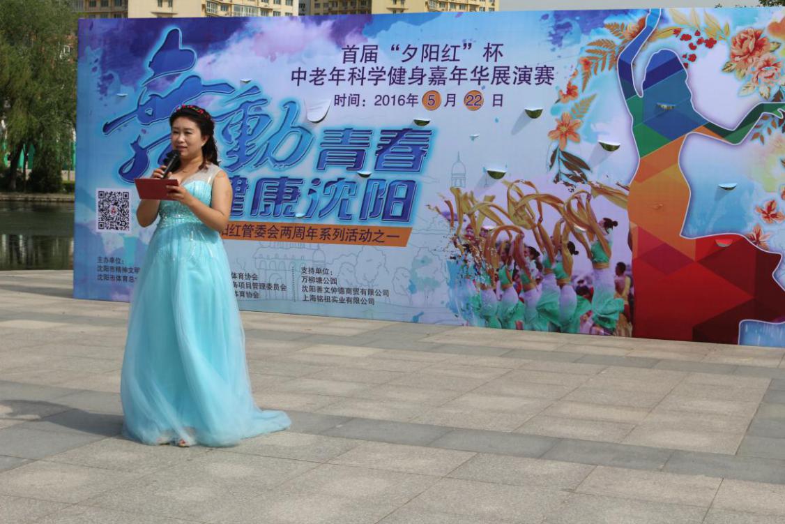 主持人-夕阳红管委会办公室主任刘梦秋 荣获一等奖节目《站在草原望北京》 此次展演赛由沈阳市精神文明建设办公室、沈阳市体育总会主办,沈阳市老年人体育协会、夕阳红为老服务项目管理委员会(夕阳红管委会)、沈河区老年人体育协会承办,万柳塘公园、沈阳善文仲德商贸有限公司、上海铭祖实业有限公司提供支持。中国老龄事业发展基金会夕阳红为老服务项目管理委员会副主任聂楠、中国老龄事业发展基金会夕阳红为老服务项目管理委员会秘书长鞠铁华、沈阳市体育总会秘书长舒尊荣、沈河区文体局副局长雍宏伟、中国老龄事业发展基金会夕阳红为老服务项目管理委员会沈河区域主管薛霞等参加了大赛。聂楠在致辞中说:“在座的很多中老年人都给咱们夕阳红的慈善捐赠大会表演过节目,献出过爱心,你们发自内心的表演优美、流畅,富有科学韵律和情感,感动了很多人,也影响了很多企业及个人进入到慈善捐赠的行列中来,为更多特困及“三无”老人获得救助作出了不可磨灭的贡献。在这里,我代表夕阳红管委会感谢大家的无私付出。据了解,这也是夕阳红管委会2周年系列活动之一。