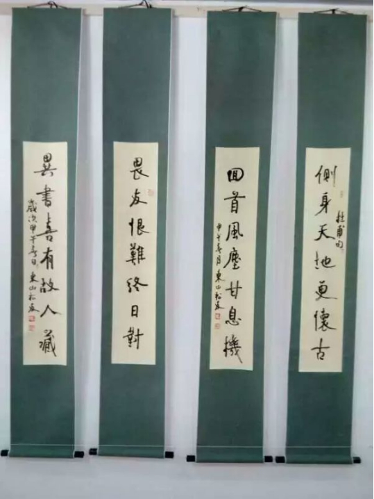 我喜欢众多师友,喜欢之多,话不胜话,友不胜友;师友、道友、茶酒友、棋友,而别号“松友”。不颠倒为友松者,以“友”字动词,相与求松为友,不亦劳乎?何必烦松如此!松如许我,我乐友之,各安性分。 我很多书作只题“松友”、“粥鱼生”或“东山松友”不名。友人有怪我作怪者,什么“粥鱼生”?什么“东山”?我实话实说“昔食粥穷人家事,今则不尔,馀好食粥,即今几每午必粥,热地瓜粥最是好吃,佐以盐瓜、芽菜、小鱼干,就爽然一餐,偶得杂以鱼腥如草鱼、色目鱼者,则风味奇佳,非三碗不饱。有闻食鱼杂粥而知味者乎?我固粥鱼生矣,自许粥鱼中数此生也”。 “东山”两字好念、好听、好意思,我喜欢。诗经豳风“我徂东山”篇脍炙人口。孟子尽心篇“孔子登东山而小鲁”。晋谢安初隐“东山”,再起而捷报淝水。喏!多响亮!异事地名且搁下不说,“东山”是我的本籍故乡,属福建省漳州,在诏安县东海中,本为铜山岛,明洪武时筑城,清初为郑成功所据,后清收其地置铜山营,属诏安县,民国改置东山县。其地紧邻厦门,外接澎湖,为东南门户,以盛产鱼翅著名。 我这个“粥鱼生”货真价实;我这个“东山松友”也十分道地。昔退之为文喜题“昌黎”郡望,吾师题字喜用“岭南”奇川或“南溪”奇川,乡宗辈沈耀初先生(诏安人)更常以“士渡人”或“士渡叟”题画。“南溪”或“士渡”怕不过一小山溪村落吧!岂有为人忘本而不念旧者乎?古诗“胡马依北风,越鸟巢南枝”为证。 多年前耀初先生在文化中心开八十回顾展时,我偕陈其茂先生约先生在教师会馆晚餐,巧遇朱铭住馆下楼吃饭,乃意外的一起共杯杂话。席上,承朱铭亲口告诉我“我也是祖籍东山”。诸位,此话虽未录音,但版权所有呀! 我少年时期,窗友谑呼“字虫”,每见纸砚笔墨,不写不快;中年以后喜执长锋毫颠,习惯站着纵放。自许脱略宗派家法羁绊,无取临摹。偶时笔下兴会,吞吐真率而意趣不夺,天钧自在。此展,师道友不鄙野田而期许有年,恐多情笑我,喻彼浮沤空尘。今当放怀,无由计思幽草晚晴之得。 兹节录1996年第一次个展之记述如下“展品约八、九十件,多即兴之作。形式上,对联、四六屏、大幅、手卷、条幅、斗方、扇面、小品等粗备(缺册页),而内容类多生活感遇咏怀念旧及戏作。纵笔或不自检,字句不免矫转不类,间有脱漏根由者,唯不趋时囿习,又无涉造谎。综览一过,自承体势不全(缺隶,且甲骨羞涩),品相平平而已;恍有临风玉树之姿,得无激峭丑怒之气?亦知聚筋敛骨劲之不足,敢望奏点曳定变裁成之功境”。 “明年此时,我将挥别二十六年教书生涯,拣在退休前打理这次个展。我何幸在广袤的墨野畦径间翻跃奔驰了两百个晨昏,套一句佛典功不唐捐”。 “任情恣性正是放怀,顺性适志真的得意!老骥伏枥,烈士暮年:我正好迎接七十从心的到来,教剩下的牙齿全掉光了吧”。 在家乡亲友的鼓励协助下,2015年迎来了人生中第二回的个展,1996年离现在已经19年了,今年展出作品以行楷为主,这一次我展出作品最大的特色是寸楷,如归去来辞、喜雨亭记、醉翁亭记、童心说,请大家多多交流批评指教。