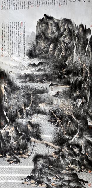 《深谷幽居图》124cmx248cm于军福作 正是基于于军福这样切实深入的研究,包括把历代各家笔墨技法与造化形象的具体印证,反馈到其作品中,便形成了不与人同的艺术风貌。军福于王蒙,石溪用功最深,体会也最深,而笔墨的朴实沉厚,又有沈周的性格,因而形成了其作的宽博气象。