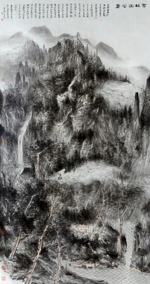 云起秋涧图,(2015年68cm×136cm)于军福作 正是他对传统和西画技法的吸收改造与融合,使得其作在抒情与气息上与传统获得了连接,在视觉空间上获得了当代感的图像体验,并形成了浓厚的抒情风格。他在创作中把自己跳动着的磅礴的感情,春蝉吐丝般虔敬而又深情专注地化作笔下的功夫,把自己的深沉思考通过水墨技艺而变成独特的审美透视,散锋峻点山色,灵动飞扬,细腻而又富有层次,与天地交流的道家生命意识,更包容进佛家慈悲为怀的理念及其庄严神圣的外在特征,而这些内容的笔墨又完全是充满了儒家精神的技法。