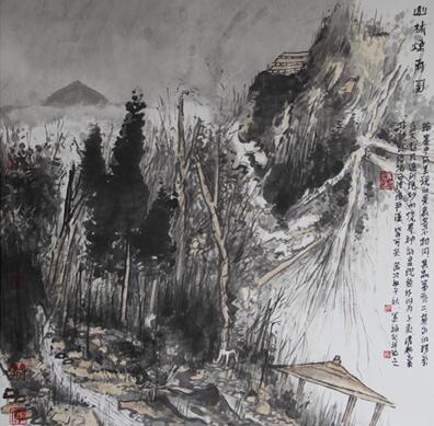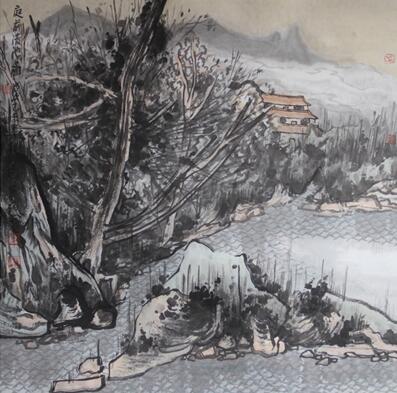 幽林烟雨图,(2015年68cm×68cm)于军福作 如果说,于军福先生的山水在笔墨和蹊径两方面更多地着意在传统的气息,那么,他的色彩辅染,尤其是用水,用色都赋予了传统以新意,拉开了与传统山水审美观感的距离,拙朴的笔墨笼罩以清秀的色彩。于平正老实中又焕发出灵逸聪颖的风华,形成了自我的面貌,这一风华,因为是从厚积的基础上薄发出来,有脚踏实地的功力基础,所以相比一直超入的冲击力,更具绵延不绝的亲和力和艺术感染力。