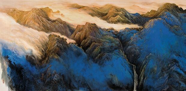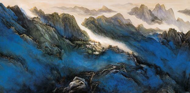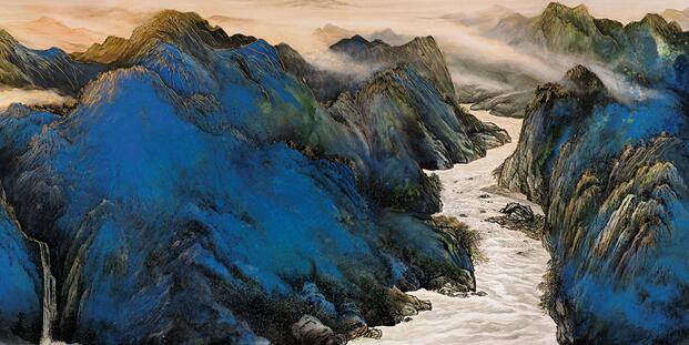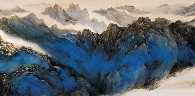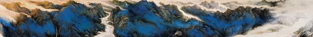 【名家评论】 ·邵大箴 大风景,大格局。 《看山要看祖国山》是万鼎绘画历程中最辉煌的一件作品,反映了他艺术创作的新高度,也是我国山水画运用新材质传达传统文化精神、拓展表现语言的崭新成果。他之所以取得如此成绩,充分说明他牢记长安画派一手伸向生活,一手伸向传统的艺术主张,在扎根生活和研究传统的过程中,善于用心领悟,并能融会贯通中西绘画原理,别出心裁地进行创造性的探索。从万鼎现有的成就我们可以预测和期待他未来更为广阔的艺术前景。 ·王镛 “夺得千峰翠色来”是唐代诗人陆龟蒙称赞越窑秘色青瓷的名句,用来形容万鼎的巨幅山水画《看山还看祖国山》也相当贴切。这幅泼彩泼墨的青绿山水呈现出堂堂中华泱泱大国的恢弘气派,浓缩了祖国大好河山的壮丽景色,凝聚着画家热爱祖国的深挚情感,尤其是那种苍翠欲滴、鲜丽厚重的蓝色调,为人民大会堂增添了一道赏心悦目的光彩。 ·尚 辉 中华民族的伟大复兴必然意味着文化艺术的复兴,这可以在当代一些典范性的文艺作品里获得印证。新近在人民大会堂二楼东大厅落壁的由万鼎绘制的中国画《看山还看祖国山》,既是这样一幅以表现日出东方的山水意象来象征祖国日新月异、繁荣昌盛的山水画卷,也是当代中国山水画立足传统、走向现代的黄钟大吕之作。是为我们这个崛起了的中华民族,谱写了一曲彩墨淋漓、荡气回肠的祖国颂。
