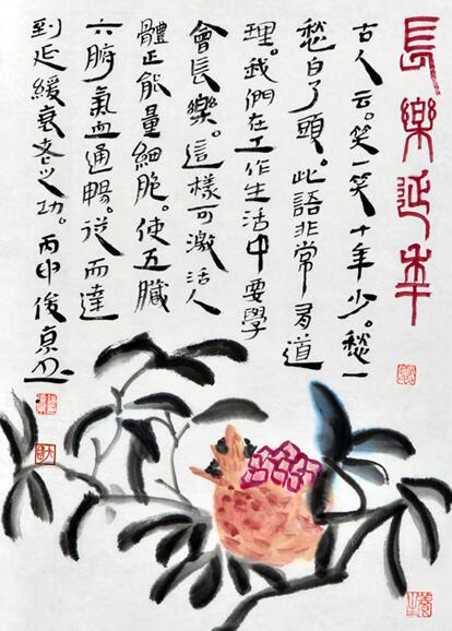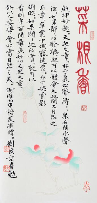 刘俊京先生所有的成就,皆来自他的博修。其恩师欧阳中石先生是集历史、逻辑、诗词、京剧、书法、绘画于一身的大家,刘先生不仅学其书法,更是苦心钻研以博学,其“养生书画”在形式、内容上均给人焕然一新之美感体验。博取众家之长者,必能有非凡成就,常自言道“博修才能恒远。”