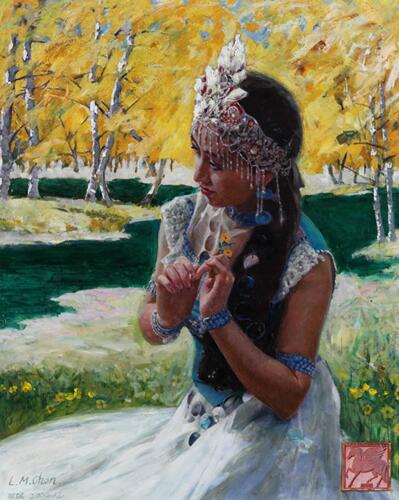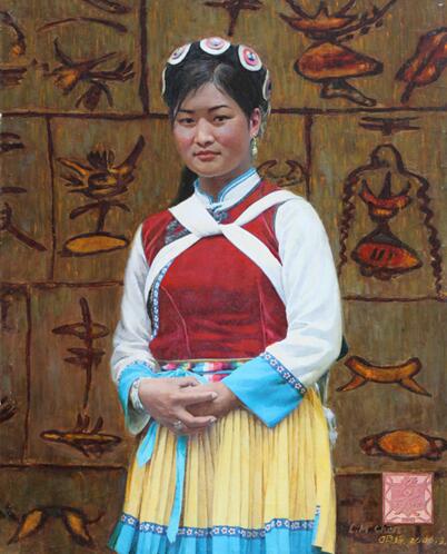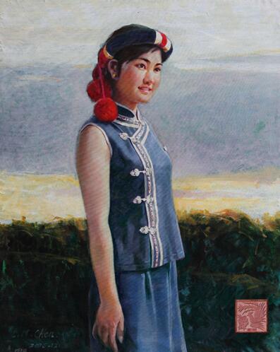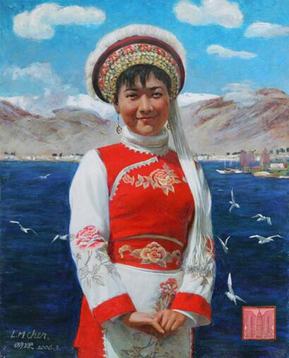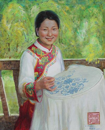 绣花女-中华民族·丽人行之15 土家族 和颜悦色 美丽讴歌 ——林明琛油画《中华民族·丽人行》观感 (文/陈卫和) 以我的湖南人感觉,一直把林明琛先生视为老乡。一方面是因为他有相当一段在湖南工作的时间,在我们那个学画的年代画油画的人不多,而他在湖南美术界已经享有名声;另一方面是他对油画从实践到理论的那种执著,类似于湖南人的“霸蛮”气质,使他不断有所成就。 林明琛先生是海南人,求学于广州美术学院油画系,毕业后在湖南做过单位美术宣传干部和出版社美术编辑,调回母校后从事色彩基础课教学,有着坚忍不拔的从艺经历和超群卓著的学术成就。他说这几十年来,他主要做了三件事:一是上世纪80年代,参与创办以朱光潜、王朝闻为顾问的我国第一部普及美学知识、进行审美教育的刊物《美育》杂志,召开了有王朝闻、蒋孔阳等全国诸多美学家、教育家参加的“全国首届美育座谈会” ;二是上世纪90年代在美术学院里首先开设了“艺用色彩学课程” ,并结合教学撰写了教材及出版了专著《艺用色彩学》;三是进入21世纪创作大型油画组画《中华民族·丽人行》,并争取在此后在国内外巡回展出。 多年前他就向我介绍了已经开始的创作计划,描述他在穗港两地间的创作奔波,我因此陆续看到他创作的部分油画作品。最近他告知创作计划已经基本完成,闻之鼓舞,兴起成文。 观看林明琛先生创作的油画,给我印象深刻,感触颇多,略说三点。 妙哉构想 “五十六个星座五十六枝花,五十六族兄弟姐妹是一家。”当湘妹子宋祖英以一曲《爱我中华》唱响世界时,激起了我们中国人自豪的情怀,奋起的意象。当音乐作品灌注的激情化为隽永的视觉形象时,我自然在林明琛先生的《中华民族·丽人行》油画作品中得到共鸣。确立我国各民族的妇女形象入画,以五十六幅女性肖像展现不同民族的历史文化、自然环境和健康美丽,这不仅需要画家的美好愿望,而且还要深厚的艺术功力,力求意匠天成的境界。从林明琛先生的这批油画作品中,看到了画家的如此追求。 艺术家都喜爱通过女性的形象来表达情感,女性似乎更容易成为美的化身。站在一幅幅以写实手法绘成的各族少女肖像前,能够感觉到画面透出散文诗般的意境,流淌着理想美的颂歌。在写实性绘画中表现少数民族的作品不少,有些画家难以挣脱现实的束缚,干脆陷入记录性的描绘,从而给人们留下粗俗落后的形象感受。而在林先生的画作里,我们却感觉到了各民族那少女般的健康和美丽,这不能不说是画家与我们大众共同的理想憧憬。当然会有些人认为艺术应该深刻,不能太流于表面,但是当人类精神停驻于理想层面时,艺术也应该允许憧憬。德国诗人歌德曾经唱到:“永恒之女性,引导我们走!”这女性便是艺术的理想,她在指引着艺术的未来。中国汉字初创时也把女性和儿童放在“好”之中,由此可见把少女和艺术牵在一块,有着人类美好理想蕴涵的渊源。那么,艺术家把这种美好的意愿凝结成为视觉中那美好的一刻,比某些故作深刻的作品来得轻松,也必然更加受到大众的欢迎。 我在观看林明琛先生的油画创作时他就声言:“我力求展现每个民族最美好的一面!”通过对中华各民族妇女艺术形象、民族服饰和环境背景的艺术处理,既描绘各族人民未来的理想化身,又寄托画家对美好的艺术追求,可称为林明琛先生油画创作上的奇思妙想。