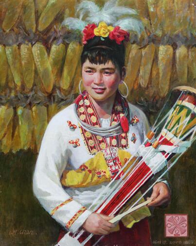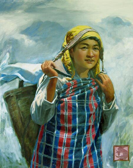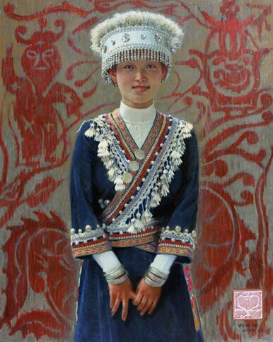 畲家女-中华民族·丽人行之22 他的作品以高雅的色调、明朗的色彩组成,技巧上充分发挥了油画的丰富表现力:有古典的多层画法,也有近代的直接挥酒表现。人物个个性格开朗、鲜明、活泼、健康、美丽,加之配上各民族本身的服装、衣饰和背景、道具等等,使各民族的特征、爱好,甚至理想和追求都一一跃然纸上,实在令人目不暇接,琳琅满目。我相信这一套组画会引起无数人的美好回忆和长久的关注。