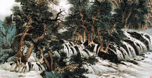 他的《苍山圣境图》,见墨于无形之水中,尽显有形山色,表现出烟雨遍染山峦的水墨韵味,浓淡有致的山景出自画家表达意蕴的心境变化,浑朴天成的画面,散发出山水画新的生命力。 周成先生在山水画创作中“善用月、善用松、善用色”,他的《苍松月圆图》,力求以深邃的意境,表现画家对大自然独到的感悟和对生活的热爱。数株青翠的苍松,勾勒出整个画面,在月光的映照下显得高大、苍劲,画中圆月、山石、流水,为古松夜色创造了宁静的气氛,画家歌颂松树的风格和顽强的生命力,喻示艺术要充满活力,才能达到高尚的境界。画家的《苍山雪霁图》、《春满青山》以及《浩气长存》等力作,把山水画的现实感和艺术想象力桥面的融合于一体,画面敷色淡雅,山颜、树色协调舒畅,似乎在山峦间飘现细雨,又宛如在烟云中显露群峰,山有形,又不规则于自然造化;树有形,又不形同于人工雕琢。观其境,变幻莫测;悟其意,难以言喻。周成先生把自己从传统国画的笔墨中创新的“新泼墨山水画”壮丽而厚重的特色,发挥到绝佳的境地。