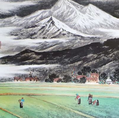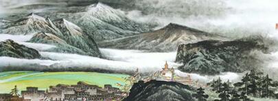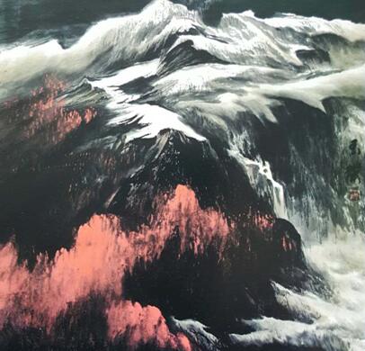 这些作品通过浸透式的色彩冷暖对比,用冷调暖处理的手法。寻找意向符号中色调情感特征,在储蓄幽静抒情意味中创造色调意境,达到意向中的情感升华,完成一种情调和韵味;《布达拉宫的曙光》、《深山藏古寺》、《雪山圣地》、《夕阳下的祁连山》等作品,借助旭日、夕阳的景色将白色经塔渲染成红色,再用墨色或青色点缀出古寺,配以五彩缤纷丽多彩的经幡置于连绵雄奇雪山之下,着意把客观色调转入主观情感中的意向色调,使画面色彩强烈而丰富,有一种浓郁的藏区风貌,观后让人动情;《黑河大峡谷》跌宕起伏的山谷横跨在连绵的雪山之下,他用红色和橙色的夕阳过渡出空间,潺湲的泉水不时的出现在时隐时现的烟岚中,使大峡谷增添了神秘的气息;生成一种景物为情思的诗意化色彩品格,而在《近天湖水景更美》中则使用了冷色调的处理,近处平静的湖水用石青色渲染与远处雪山相映成辉,给人一种“又恐琼楼玉宇,高处不胜寒”的“删拨大要,凝想形物”的意向思考和“俯仰自得,游心太玄”的境界,这些皆因玉璞领悟了至真至纯的山水大美中的自然之气、意境之气、精神之气等诸多方面的真谛,又娴熟的把握,笔、墨、色的技巧,使他毫下笔墨一挥而就,彰显出他所表现出来的大山、大水、大气魄、大格局,惟大美抒怀的画作。