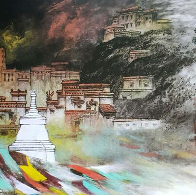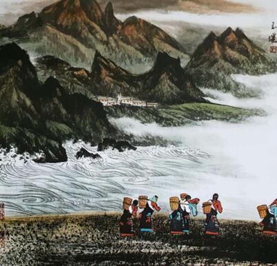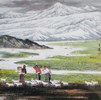 “外师造化得心源”,尤其他创作的来源于生活中的青、藏、新疆山水画系列作品,绚丽多彩、意境高雅、气韵生动、浑厚质朴、神形兼备、气魄宏大,在这些作品中他有着对绘画艺术的敏锐表现力和深刻的精神内涵与感悟。使他能从高寒广褒神秘苍雄的青藏高原,厚土苍生、荡荡辽阔的新疆西城中提练出精髓,将笔墨融于自然之间;着力用画面把外部景观和精神内涵和谐统一地表现出来,使作品有一种高旷的胸怀与情操。他用朴实雄健的笔力、饱满厚重的墨色,并施于朱砂、石青、石绿等多色并用与墨交融;形成了多样化构成,增强了装饰及趣味性,打破了以往简单的景观化叙事。使作品在豪迈中不失深沉,粗犷中不失悠远的笔下,传奇生辉般地再造出来。他所使用的笔墨色彩皆从形象、形式美感来突破,增强了情致和抒情性因素,又以个人心悟体会为主,启迪着心灵,抒发着情感,使情感与笔墨交汇;凸现出他的作品从自然到情感、到意境。再到笔墨。达到一种物我两忘境界。如《山中神意深》、《佛地信徒》、《碧岚青黛》等高原山峰雄伟壮丽,山中缭绕的云烟、庙宇、楼阁、古树飘渺起伏……仿似高原真面目欲出跃然眼前,呈现出从绘画语言到观念上多方面拓展,这和以往的作品有着迥然不同的神秘气质和深邃耐人寻味的绘画风格。