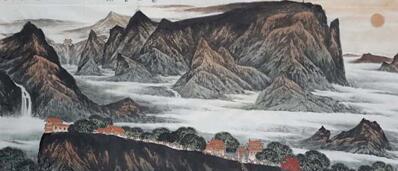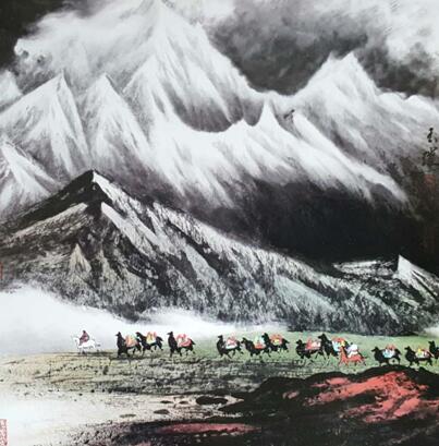 在这些作品中他更加注重神韵和灵性,挖掘深层次的文化内涵,强调了从现实性转向精神层面的诉求;从有限中找无限,从无限中体现意蕴,在神、妙、逸、灵上下功夫,通过各种构图和笔墨技法,在方寸之间找寻一种精神表达,心性表现。从内容到形式,从笔墨到色彩,从情感到意境,从意境到境界,从境界到化境。使作品寓意深刻,浑然天成,到达至真崇高的美,让观赏者有一种跨越时空遐想。如《神韵青海湖》、《气象万千》、《天下黄河第一湾》等,他从远、近、高、低多视角全方位移步换形,观察大自然之态势,取天地之意趣,得天地之灵气,畅快淋漓的描绘出气象万千的境界,令人神往,荡气回肠。又如《一鸣警天地》、《云深僧意闲》、《古丝路上驼铃声》、《云里僧寺》所表现出来山的雄浑、云的流动、变化万千的景象,可谓神情飘逸、意趣横生、动人心魂,使人读之,思绪万千,心旷神怡。