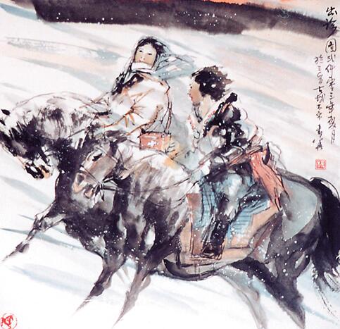 当年在部队,黄胄先生授杨书华一秘诀:“要天天练速写,坚持数年,必可成器。”为此,他曾三下天山牧场,五赴内蒙草原,画了数以万计张的速写,终于在马儿跳跃奔腾时领悟其最为迷人的瞬间。他笔下的马多为四蹄翻腾,神态狂放,如一长啸的歌者。其实画马是较难超越的一个画种,在中国很难有人逾越徐悲鸿大师这个艺术高峰,因为那是一个典范,一种极致,是国人的骄傲,含有太多的沧桑、悲壮与热情、张扬。显然,他的艺术成就与他的个人经历不无关系。