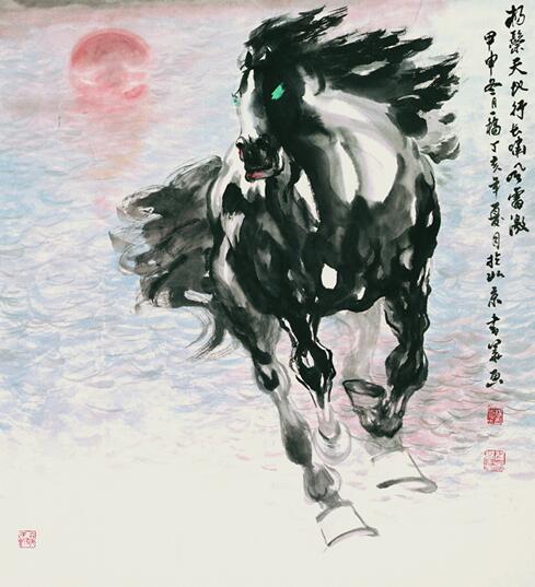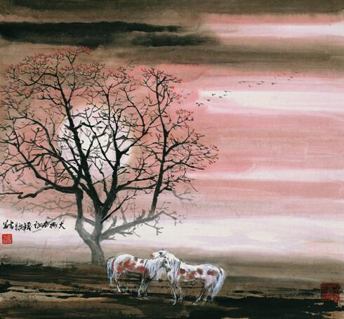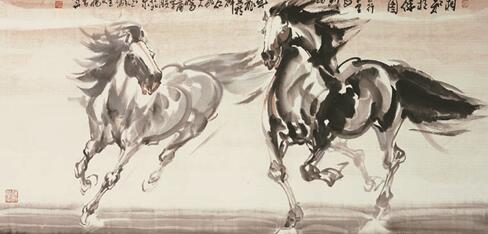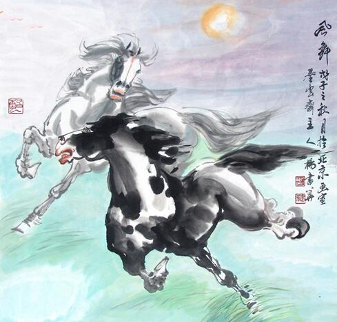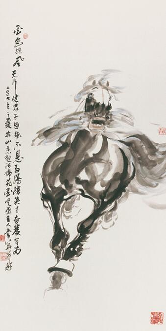 不难想象,书华从零起步,以怎样的毅力,经过漫长岁月的跋涉,翻过一座座大山,吸收自古以来那些画马名家共同追求的绘画状态:既文静、淡雅、秀润、俊逸的状态;即使我们的画马大师悲鸿先生,他一生的突破点也仍是把功夫下在人物上。论专题画马,当今有书华画马的那种神韵,那种气度,那种激越豪情,并非多有。从他的件件作品中,我们可以听到他在为中华盛世放歌。也许是画家所处的沸腾时代环境与前人迥异,他以笔为刀,剖析自己,以血为墨,画我所爱,有情有诗,向世间倾诉着人生哲理,并毫不掩饰地让我们看到了画家的心胸、气质、品格及个性的自然流露。