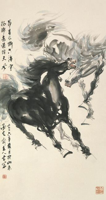 再有,我还高兴地看到书华发扬“骏马无疆”的精神,他自费走到世界16个国家,尤其他旅美作画期间,在美国举办骏马艺术巡展,每到一地总不忘在艺术及精神上滋育他的悲鸿大师,在世界华人中间努力弘扬悲鸿爱国精神、宣传悲鸿的人格魅力。正像他所说,人生来世一回,当就当悲鸿那样的爱国画家。为此,他以马为象征,老骥伏枥,立下目标,决心10年内要走百个城市,百个农村,百所学校百个部队,并把感人瞬间的骏马创作成意境高远的精神产品奉献社会。这就是书华所实践的“笔墨出于手、实根扎于心”的高尚境界,也正是他有着这种赋于物像以生命造型能力和感情根基,才使他的作品能得之于形,畅达于意,情尽神妙而焕发出流光溢彩的风趣。