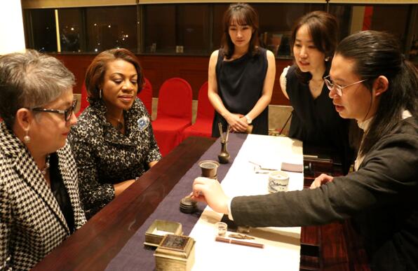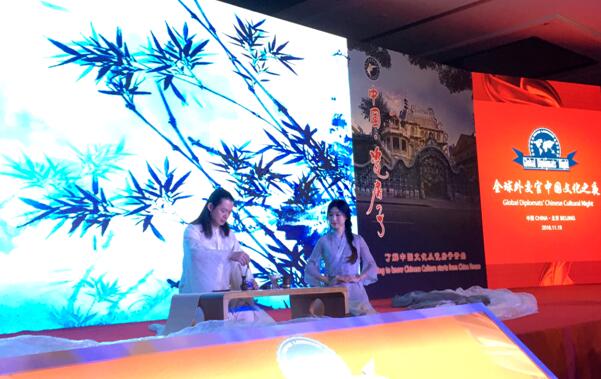 2016“全球外交官中国文化之夜”19日晚在北京举行,来自100多个国家和地区的外交使节及联合国、国际组织驻华代表与中国政府官员、中外企业家、跨国公司代表齐聚一堂。本次活动以“文化先行,助力‘一带一路’”为主题,特邀心灵音乐家三强先生、香学艺术家罗子杰先生共同再现古代先贤畅怀舒啸、焚香侯月的场景。