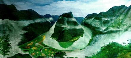 广西红水河因流经红色砂贝岩层,水色红褐而得名。红水河第一湾位于广西东兰县境内,红水河在这里拐了一个大弯,形成一个“U ”字型的大峡谷,河道狭窄,两岸高山耸立,直插云天,云雾缭绕,蔚为大观。相伴的山峰,拟人拟物,惟妙惟肖。一块岩石,就是一个景,都是一幅画! 宁学,广西知名画家,玉林兴业人,毕业于广西师范大学艺术系。艺术功底扎实,文化底蕴深厚,擅长油画,对传统书画也颇有研究。其作品色泽丰富明丽,形象简括生动,富有强烈的时代气息。宁学画家出生岭南之农家,自幼酷爱艺术,虽然生活历经坎坷,仍勤学苦练,深入体悟生活,将传统文化艺术的技能和气韵融入西画光色之中。他以习总为题材的巨幅油画《昂首高扬》,目前广西第一大马油画作品《骏马腾飞》,羊年创作的《巨羊图迎春》及巨幅油画《德天瀑布》使他艺术造诣跃上了一个新的高峰,同时奠定了广西书画界的地位!
