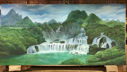 近日,广西知名画家宁学在南宁完成了巨幅油画《红水河第一湾》,这是宁学画家继《德天瀑布》后又一幅以广西本土旅游景点作题材的又一幅巨作成果。这幅油画作品长4.2米,高2.1米,耗时三个多月完成。作品气韵生动,清新脱俗,大气蓬勃。
