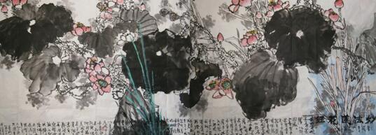 花鸟画,尤其是画花,“妙在传色”。欣赏大作简单,分享其之美却非易事,因为解道者深处道内,解道之内,难见道之外,大美难言尽,故以道解道,道之不解。徐德润善画荷花,因为他对荷花情有独钟,周敦颐的《爱莲说》写得好:水陆草本之花,可爱者甚蕃。晋陶渊明独爱菊,自李唐来,世人盛爱牡丹。予独爱莲之出淤泥而不染,濯清涟而不妖,中通外直,不蔓不枝,香远益清,亭亭净植,可远观而不可亵玩焉。荷花以其“出污泥而不染”的品质备受众人喜爱。所谓一方水土养育一方人,因荷花是济南市的“市花”,土生土长徐德润自然对荷花有别一样的情怀。他以感情的语言、笔墨,以至内涵都意境深远,独领风骚!徐老笔下的荷花如语如诉;或恣肆如瀑布式的倾泻于丽日朗照之下;或轻盈地飘摇在清风中,其墨叶,浓的蓊然沉郁,淡的洒然飘逸,浓浓淡淡间,纯粹得恍若天地鸿蒙,中锋粗壮而不涩滞,侧锋空灵而不枯扁,亭亭的荷茎和荷芰生机勃勃地滋长蔓延着,支撑着生命的绚烂绽放,他把荷花赋予了鲜活的艺术生命。徐老的作品典雅大方,气势豪放,重墨浓彩,更兼其典雅大方。既有传统风貌,又吸收油画、水粉的色彩之长,在作品中强调视觉效果和冲击力。徐老用笔潇洒,墨色含蓄,保持自然物象的生动活力和质感;刚柔相济,已臻于浓而不俗,艳而不媚,似有“浓妆淡抹总相宜”的艺术境界。