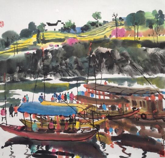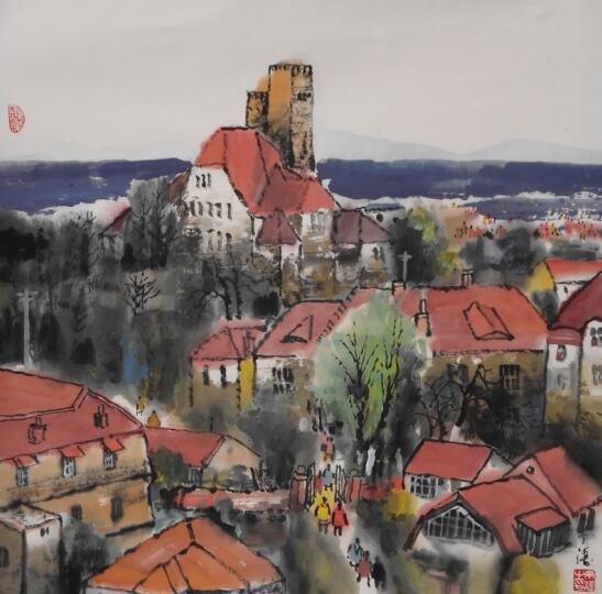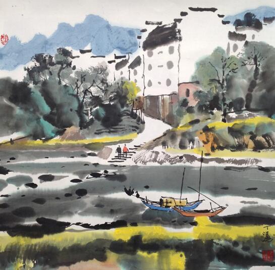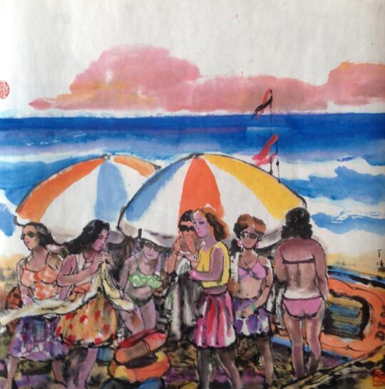 《青岛》 68×67cm (文/丁涛)走进国画中,舞墨于宣纸上,其乐趣远远超乎我之想象。 1989年应邀在泰国举办油画个人展,展期临近,经纪人问我:“能否画些国画”,我表示不行,他随口说了一句“中国人怎么不会画国画” ?在异国土地上,我的爱国心被这句话所激励,鼓起勇气,在宣纸上画出第一笔,笔一落纸,墨跑了;再一落笔,水洇了没有形,几经试验,好不容易画了一张《长江载运图》题字签名,结果又写的不是地方,整张画废了,我翻出自己多年的水彩功底,又参考资料,反反复复画了很多,没几张象样的,不过在展出时竟也被人收藏;我心知肚明,这哪里是国画,仅照猫画虎,涂抹其表而已;过后收藏者纷纷来找我盖章,方领悟,有名无章,不算成作,只好手绘朱印敷衍过去,直至今日,仍有歉意。