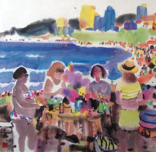 《海滨》 68×67cm 十年后来到法国,站在一个多世纪前的法国作家雨果的三百多幅绘画作品前,我心震撼,那些全部是中国墨、颜色描绘山水,人物,个性鲜明,泼墨淋漓,强烈的传达出画家对东方文化的尊重和传承。做为三千年文明古国之后人,且不能驰骋于自家画种,岂不自责,于是开始真正意义上的国画绘事,其乐融融,其趣盈盈。