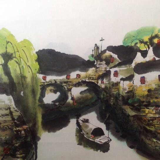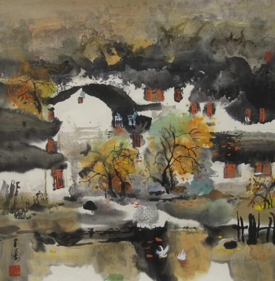 《廊桥》 68×67cm 彩墨画里墨与色相互渗透所产生的奥妙变化,笔落纸面撞出的偶然效果,是其它任何画种无法达到的,其表现意味,唾手可得,每一块自然天成,都是一个精神世界,我流连其中,乐此不彼。