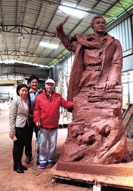 ![]() 潘鹤:中国雕塑界泰斗。1925年生于广州,祖籍广东南海。现为广州美术学院终身教授。曾获“首届中国美术奖终身成就奖”。 ![]() 潘放:1957年生于广州,潘鹤雕塑院院长,中国书画院特聘雕塑家,国家二级美术师,中国雕塑学会会员,中国建筑装饰设计协会会员,广东美术家协会会员,全国城市雕塑创作设计资格证持有人。 ![]() 冼星海(1905-1945):广东榄核人。中国近代著名作曲家、钢琴家,是中国民族新音乐事业的先锋,有“人民音乐家”之称。冼星海代表作《黄河大合唱》、《在太行山上》、《到敌人后方去》、《生产运动大合唱》等,至今仍广为传唱,成为唤醒中华民族觉醒意识的号角。 ![]() 赵旭虹女士、潘放先生、潘鹤先生(从左到右)和冼星海雕像在一起 A 缘起 “南国箫手早闻名,文化名都苦追寻。救国军歌感肺腑,黄河合唱荡激情。高亢战歌发怒吼,大众救亡谱呼声,崭新音乐拓历史,领袖题词慰生平。” 冼星海,人民音乐家。 南沙榄核,冼星海故里。 冼星海,是我们永远的骄傲。 越来越多的人,走进南沙榄核,走进星海故里。 过去,这里是温婉水乡、疍民福地。现今,这片热土发生了更多喜人的变化。 星海故里,榄核寻踪。 在这里,似乎有关于冼星海的一切:湴湄村,建设了冼星海纪念馆;镇上,有星海小学;每年,这里都会开展纪念冼星海的大型文艺活动;大型电影纪录片《冼星海》在榄核湴湄村拍摄;冼星海女儿冼妮娜及后人多次回榄核镇和湴湄村访问,追忆冼星海在榄核生活的点点滴滴…… 今年年初,有一个想法,最后在榄核镇形成共识:在榄核的核心——星海文化中心广场,建立一座具有深刻文化内涵和高超艺术水准的冼星海雕塑! 很快,榄核镇有关方面开始物色有分量的艺术家进行策划。他们联合羊城晚报报业集团,寻找作者。羊城晚报艺术研究院经过多方求证考察,决定邀请中国雕塑界泰斗潘鹤先生担纲。不过,潘鹤先生年已九十有三,能承担这一创作任务吗?羊城晚报艺术研究院多方沟通,终于说服潘鹤先生出山,与其子、著名雕塑家潘放先生联手打造这一座冼星海雕像。 又一大型公共艺术创作任务,落在了潘家父子身上。 潘鹤先生曾说过:我很少涉及“风花雪月”的作品,也不迎合市场,每件作品都是我在不同时期对国家命运的“感情宣泄”。潘鹤先生醉心于用雕塑塑造民族之魂。这一次,潘鹤、潘放父子要为家乡、为榄核的英雄“塑魂”。