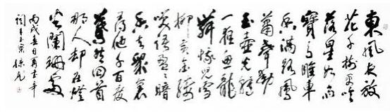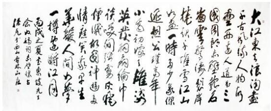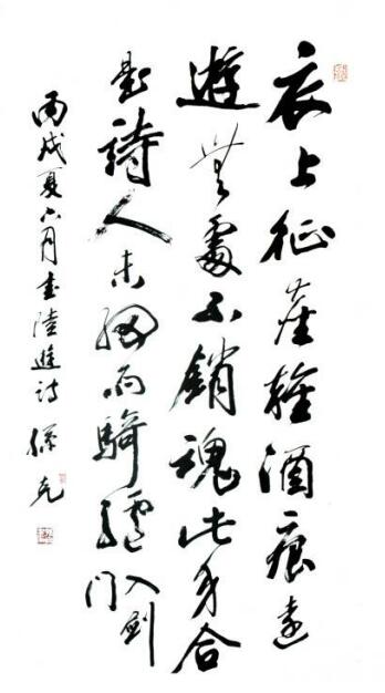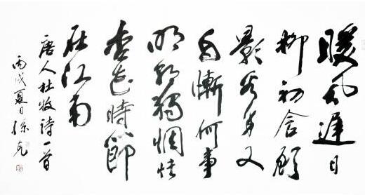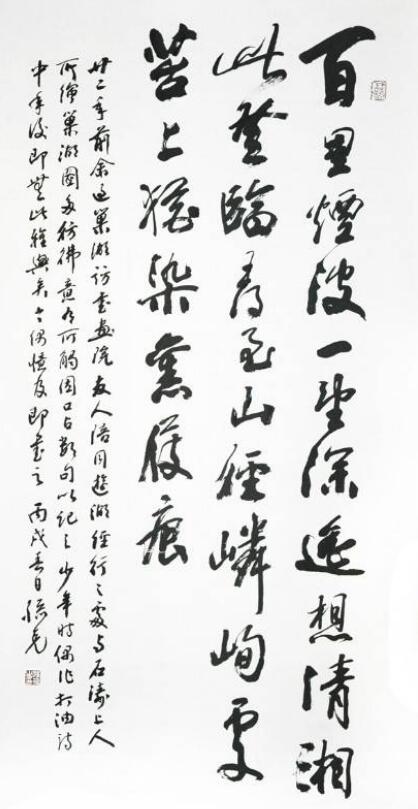 一日,余造访于甜水园寓庐,克兄题悲秋《雪梨海岸图》引首方毕。但见大字擘窠,沉着痛快,含蕴深厚,更见其案头所书条幅甚多,大率无惊世骇俗之新奇,却多雄健遒厚之内美。乃相与论书,并及书画相通之道。始知其研习书法,已逾五纪,书画相通之理,了悟有年,其力倡笔墨,推动写意,其来有之,非浅学者流随人短长者也。