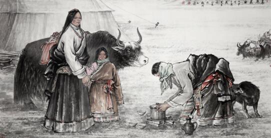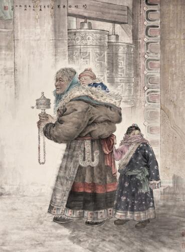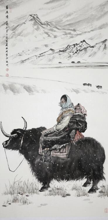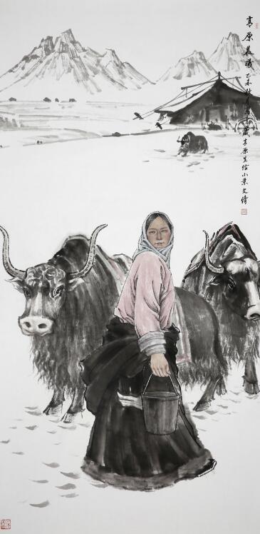 高原情 136X68cm 2016年 正是因为如此,自“五四”以来到今天,人物画虽然经历了多次的低谷高潮的变迁。但每个时期的画家都面对着同样的课题,即如何将传统中国人物画从题材,创作观念,绘画语言上进行改革与发展,以适应社会发展的需要,和时代的精神合拍。由于中国人物画家肩负有对人的精神世界,对中国文化,对东方人文精神弘扬的重任;肩负有与国家、民族的兴衰变革相交织、共命运,高扬爱国主义旗帜,激励民族自豪感,歌颂、记录祖国建设巨大成就的历史使命。不论是徐悲鸿、蒋兆和等一批从国外归来或早期学过油画的画家所尝试的将西画素描重结构、重人物内心刻画的长处吸收到中国画创作中,拓宽、开辟出中国人物画表现现实生活的新路子、新技法;还是赵望云、石鲁等一批从中国传统人物画的继承中发展,创新,推出传统笔墨表现新生活的笔墨语言和笔墨技法。都从题材、创作观念,绘画语言上突破了传统的规范而将人物画创作推向了一个新的境界。