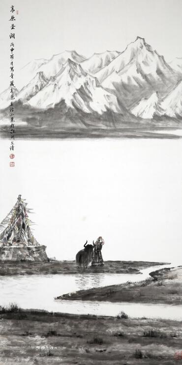 高原圣湖 136X68cm 2016年 中国人物画对形、神、气韵、境界的追求与研究,是建立在中国的传统美学基础上的。中国古代画家历来重视“传神”的表达,从理论到实践不断探索着形与神的关系。东晋顾恺之倡导的“以形写神”,着重强调通过外形,表现人物的性格、气质。这是对人物画专业角度的要求。对人物画而言,不首先解决造型,传神就无所依附。造型能力的高下,标志着人物画家基本功力的高低。关于“形”与“神”的关系,唐·张彦远在其所著《历代名画记》里有进一步的阐述:“夫像物必在于形似,形似须全其骨气;骨气,形似皆本于立意,而归乎用笔”。张彦远将人的性格、气质,即“神”用骨气来概括是非常确切的。而骨气、形似又本于立意,归乎用笔。在这里,张彦远不仅强调了形神的表现要靠形似,还有赖于画家主观艺术意向的确立,即画家的主观能动作用。所表现的形象准确之形体是经过画家主观艺术意向的取舍和夸张来确立的。只有充分把握好画家的主观能动性,才能表现出对象之神韵。意象构成的精彩处,是形象的生命运动和形象的诗意,是按照更高的目的创造出的理想的“第二自然”,是“神用像通,情变所孕”的可视可想的艺术形象。所谓“迁想妙得”正是这个意思。