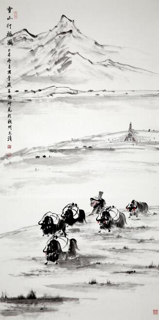 雪山行旅图136X68cm 2016年 中国人物画之如此丰富、精练的表现力,发展到当今这个多元化、信息化的高科技时代,时逢政通人和、国富民安的盛世局面。为中国画的繁荣与创新带来了前所未有的发展机遇。作为人物画家,继承中国人物画的优秀传统,发扬中国画“笔墨当随时代”的创新、变革精神,规避中国画创作中的浮躁之风干扰。深入生活,感悟时代与人生,创作出反映改革开放以来祖国建设巨大成就的经典力作、鸿篇巨制,复兴盛唐时期人物画繁荣的新局面,为时代写真,为祖国立传,是新世纪的呼唤,更是我们义不容辞的责任。 |