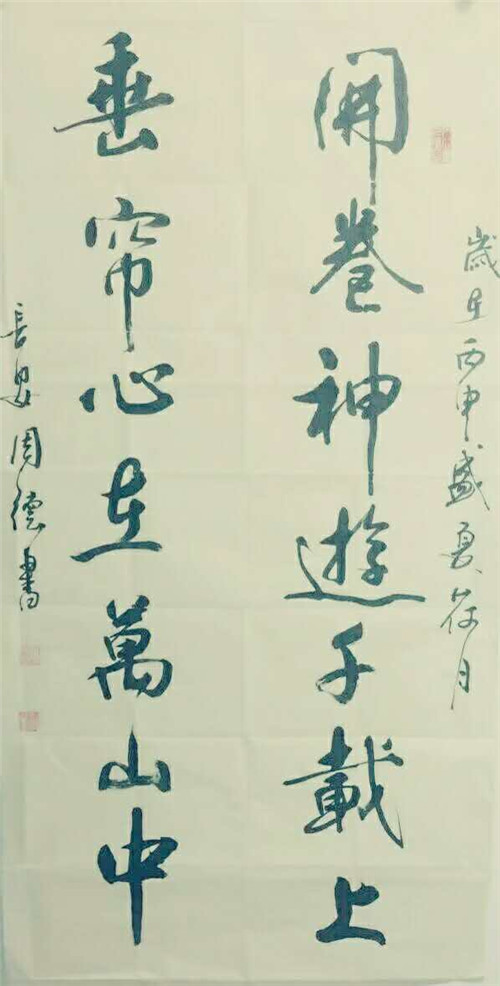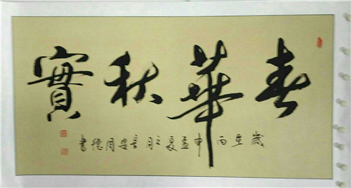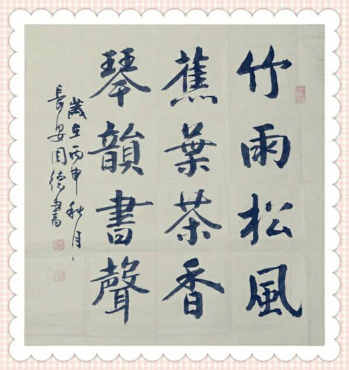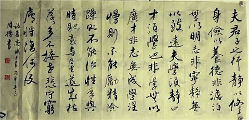 周德先生认真临习欧、柳、颜、赵、褚等多体楷书,尤对欧、颜用功最多。本人行书主要临习王羲子“兰亭序”,颜真卿祭致文稿,争坐位帖,米芾蜀素帖等。