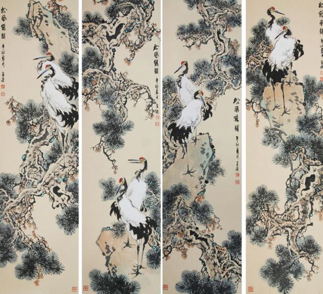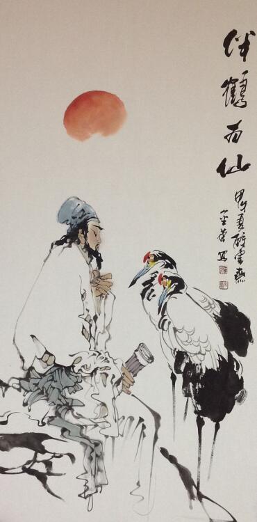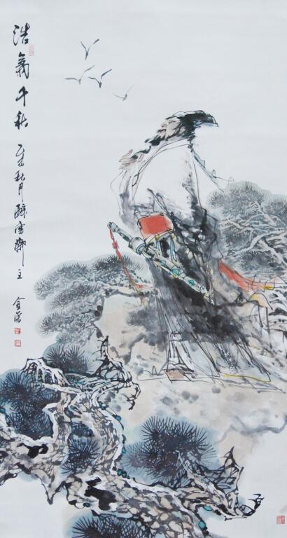 观作画是一件很惬意的事,从画家的神情中可领略到一种愉悦心神的艺术享受。张金荣作画时神情自然,右手悬笔提腕,一副陶然于画中的神态。一时笔锋如游龙走凤,线条自然简洁流畅,不仅让观者扼腕赞叹;有时着墨浓淡相宜,干、湿、焦十分得体;让笔者感到惊讶的还是他的用水用色,达到了一种出神入化的地步,在笔洗中掬几滴清水,轻轻洒在宣纸上,然后淡墨泼洒,就出现了意想不到的效果;或是用几种颜色,长峰的笔蘸水只是轻轻的调和,到纸上就出现清新的感觉。中国画讲究的是笔墨效果,这主要是取决于画家内心世界的感悟和艺术修养的融合,一个出色的画家,他的笔墨中体现着一种精神,凝聚着一种令人神往的艺术张力,张金荣先生笔下的作品就是如此。金荣先生对人物画尤为擅长,他的作品画面情景并茂,用笔洒脱,人物与景相呼应,以景托人,更加显示了人物的内心世界,使作品栩栩如生,达到了一种较高的艺术品味。读张金荣先生的画,一种超出常规的才情充盈着画面,使作品有了感人的面貌。如《清秋弈趣》,整个画面注重在一个“清”字上,让读者看到的是秋天丰富的色彩与树木的厚重,而不是苍凉与荒寂,墨与色恰到好处渲染的树叶,还有那纵横交错的根,达到了一种以景抒情的目的,而作为博弈老者与活泼可爱观棋的幼童,都富有超俗的仙风道骨的姿容。《松林清韵》如同前者,一仕女坐在石上抚琴,画面上松枝占了很大篇幅,松枝线条疏朗,着墨适中,读这副画使人想到唐朝刘长卿诗句:“泠泠七弦上,静听松风寒。古调虽自爱,今人多不弹。”作品《语鹅》则仅仅几缕迎春花,几只动态各异的鹅与老翁对面相谈,整个画面的处理得当,充盈着农家田园诗情画意,把读画者带入到王羲之的时代,那种浓浓的村墅之风扑面而来。