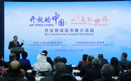人民网3月2日电 据外交部网站消息,3月2日,以“开放的中国:从宁夏到世界”为主题的外交部首次省区市全球推介活动在外交部蓝厅举行。外交部部长王毅、宁夏回族自治区书记李建华先后发表致辞,自治区主席刘慧进行推介。100多个国家的驻华使节、国际组织驻华代表以及商界代表、中外专家学者和媒体记者等500余人出席。 王毅在致辞中首先表示,今天是外交部的“宁夏日”。蓝厅搭台,宁夏唱戏。外交部举办首次省区市全球推介活动,是服务国内发展,加强中外合作的新举措。 王毅强调,我们举办推介活动,第一是为国家发展做好服务。中国仍然是发展中国家,发展是我们党执政兴国的第一要务。为了加快国家发展,顺利实现全面建成小康社会的目标,直至实现中华民族伟大复兴的中国梦,外交部要为国家发展营造更好的外部环境,创造更多的外部资源。中国的发展是由各省市区的发展汇集起来的,服务国家发展的重要着眼点就是服务各省区市的发展。 第二是为地方开放创造条件。改革开放是中国发展进步的法宝。随着“十三五”规划的实施,中国开放的大门会越来越大,开放的步伐也会越来越快。如果说过去几十年东南沿海地区是中国开放的先锋,那么随着习近平主席倡导的共建“一带一路”战略全面推进,中西部地区正成为对外开放的新前沿。外交部愿意利用自身优势和资源,为中国特别是中西部地区的对外开放,做出我们的贡献。 第三是为驻华使团了解中国国情打造平台。中国国土幅员辽阔,五千年文明底蕴深厚,各省市区都有各自的风俗、优势和发展规划。各国驻华使节的重要使命就是了解中国的实际情况,了解中国各个省市区的发展情况。外交部打造这一平台,就是要帮助各国驻华使节同各省区市政府和企业开展零距离接触,进行对接,寻找商机,扩大合作。 王毅表示,宁夏是中国中西部地区非常具有特色的省份,无愧“塞上江南”的美称。随着“一带一路”建设全面推进,今天的宁夏已成为中国对外开放的一张新名片。宁夏打造的中阿经贸论坛和中阿博览会已成为“一带一路”的重要平台。希望各国使节和各国企业能同宁夏开展更多交流合作。作为这场活动的后续,我们还将组织各国使节和媒体朋友们到宁夏进行实地参观考察。 王毅说,外交部还将适时为其他省区市陆续举办此类全球推介活动。