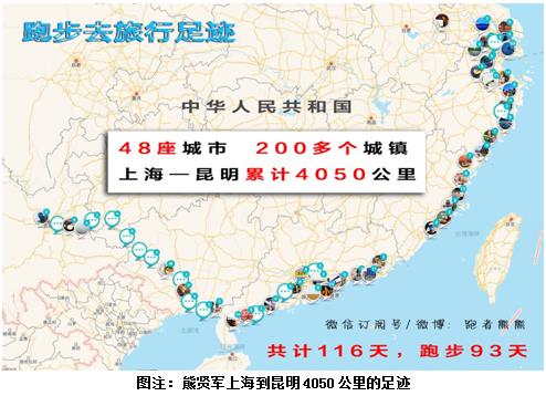 咕咚用户@跑者熊熊,原名熊贤军,陕西人。2006年来上海上大学,同年因为上海马拉松开始热爱跑步,截止2016,跑步整整十年的熊贤军萌生了一个大胆的念头。2016年9月10日,他从上海外滩启程,独自跑步去旅行。 从上海外滩起跑,到昆明滇池结束,他用时116天,实际跑步93天;途径浙江、福建、广东、广西、贵州、云南六省,48个大小城市,200多个城镇;陪跑的跑友多达500多人以上,超过百万的咕咚粉丝在视频直播见证了这次“跑步旅行”。一路下来,熊贤军觉得“比想象的要顺利”,让他相信:心存善念,天必佑之。